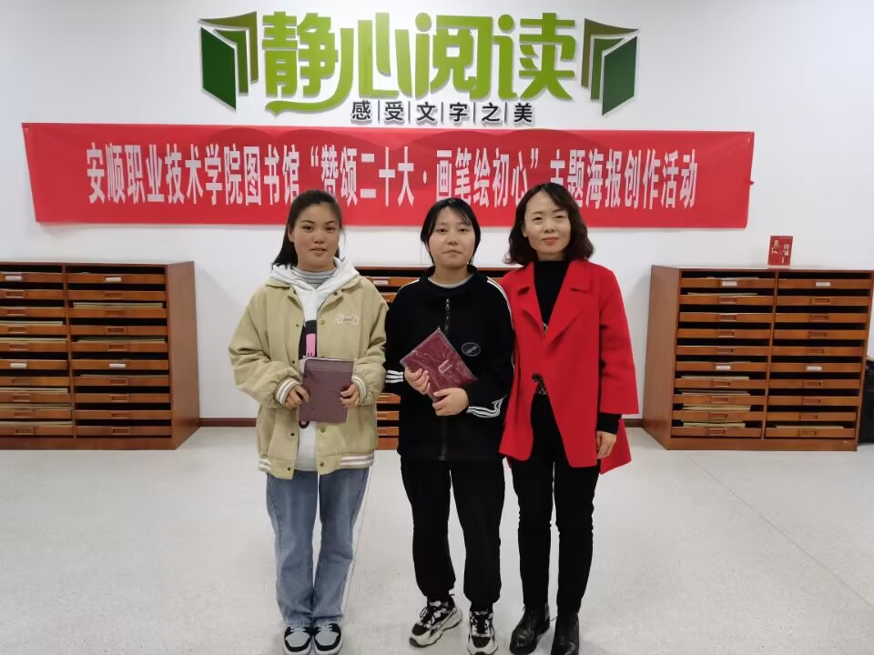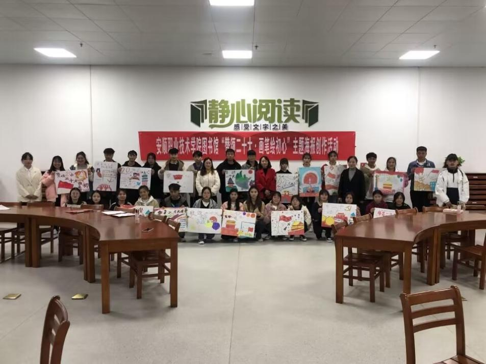 分享完毕后,同学们热情地参与了图书馆“赞颂二十大·画笔绘初心”主题海报创作活动。活动现场,同学们两两一组自由组合,形成十八个主题海报手绘小组。同学们发挥创意,以画笔述真情,把切身感受到的党的光辉形象和爱党爱国之情绘入主题海报之中。绘制完成后,与会师生通过在线不记名投票,从本次活动同学们绘制的18幅精美手绘主题海报里评出前三名作品和七份优秀作品。同学们用一幅幅主题海报作品,讴歌了党一切为了人民的初心和使命,展现了新时代风采。透过画卷,体现出安职学子对党的热爱,对祖国的赤诚之心。