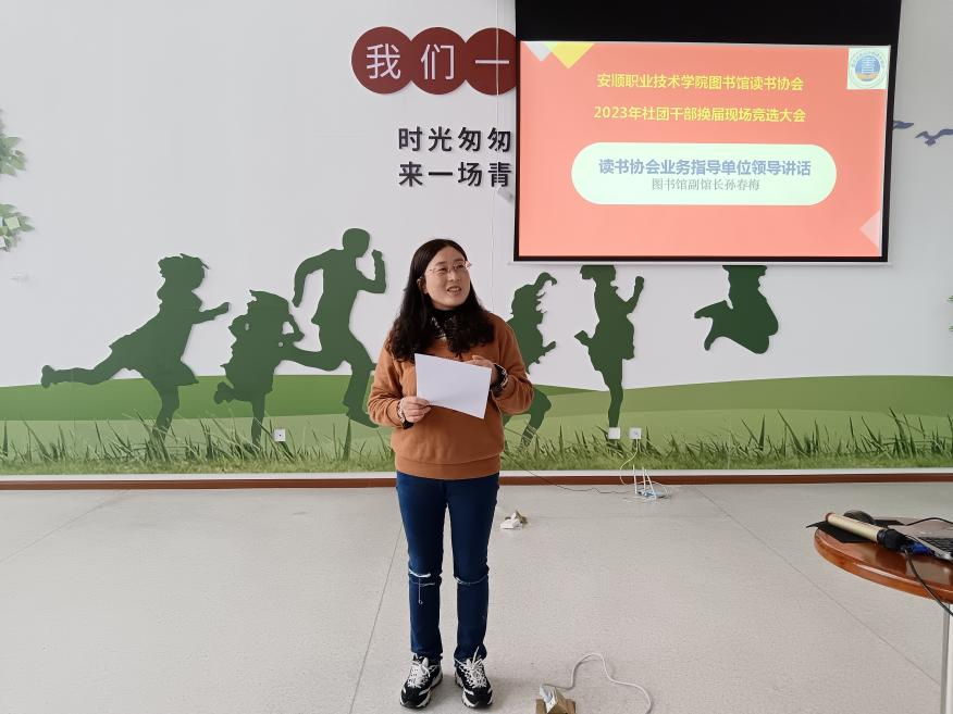 最后,图书馆副馆长孙春梅讲话。孙春梅老师充分肯定了过去一年读书协会在指导老师和社团干部同学们的努力下取得的优异成绩及对图书馆阅读推广工作做出的贡献。希望新一届读者协会当选的社团干部同学们提高思想认识,薪火相传,勤奋学习,努力开展好协会工作,把读书协会发展推向新高度,不断开创校园文化建设新局面。
