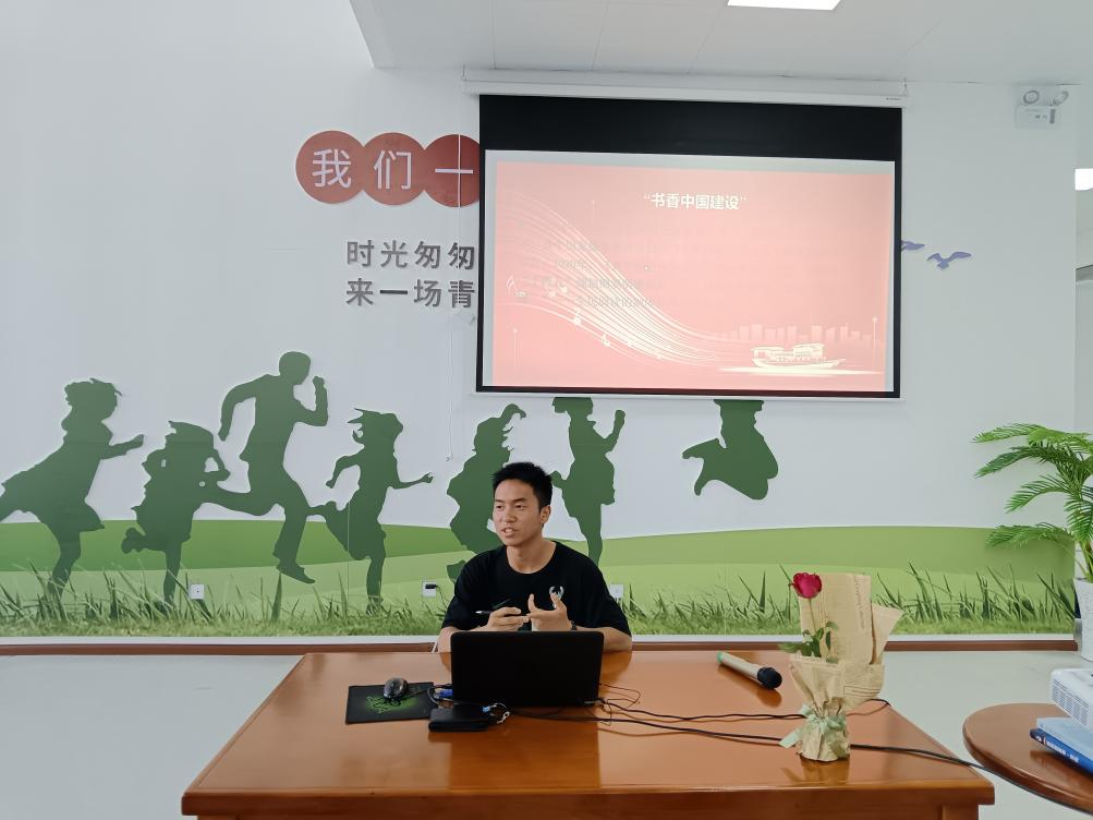 随后,习近平新时代中国特色社会主义思想读书社社长张朋贵引导与会同学学习了习近平总书记的“读书之道”,他从习近平总书记的阅读故事、阅读方法、对青少年读书的重要性的论述等方面进行了分享,还带领同学们一起学习了“形成爱读书、读好书、善读书的浓厚氛围——习近平总书记引领推动全民阅读蔚然成风”等相关论述。通过张朋贵同学的分享,同学们感受到了总书记对书籍的热爱,感受到了读书的力量。
