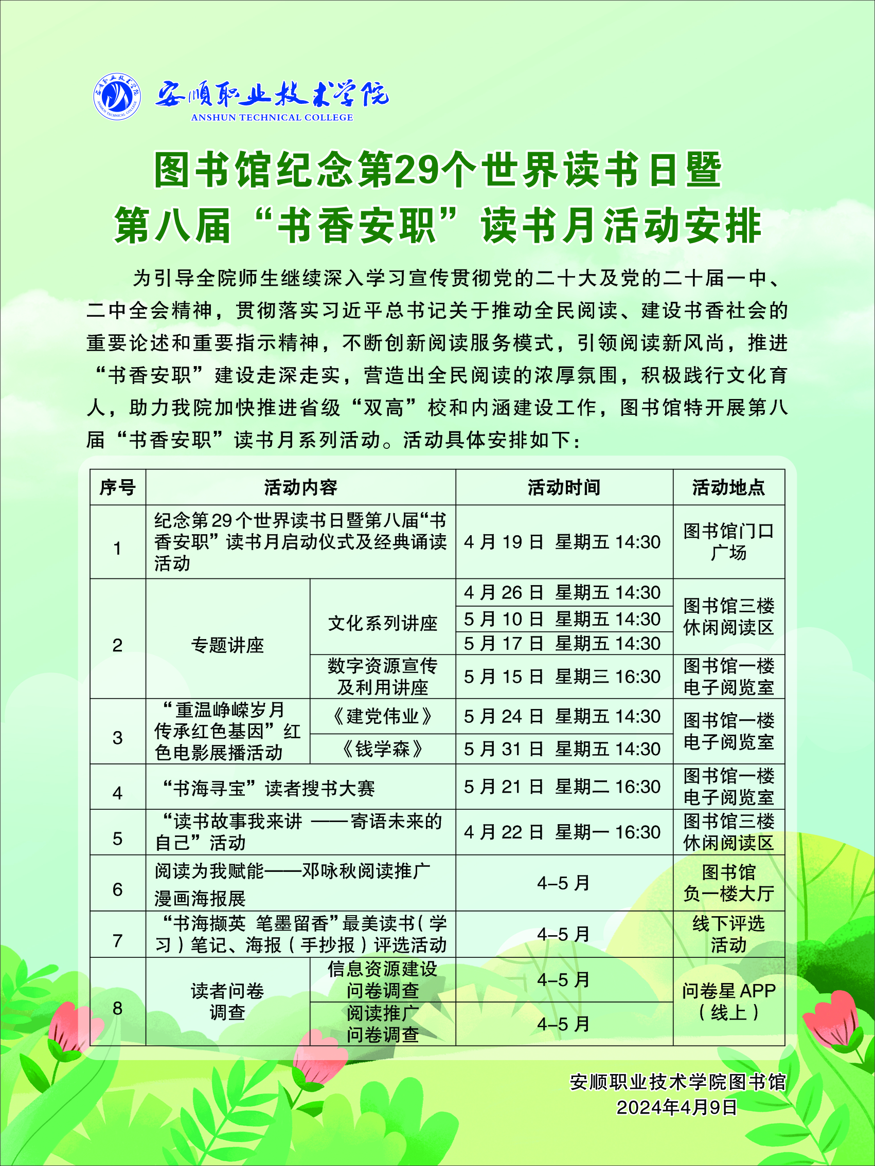 安顺职业技术学院图书馆纪念第29个世界读书日暨第八届“书香安职”读书月活动序幕已经拉开,2024年读书月系列活动主要包括经典诵读、展览、讲座、红色电影展播、读书分享、最美读书(学习)笔记、海报(手抄报)评选几大板块,涵盖多种类型。