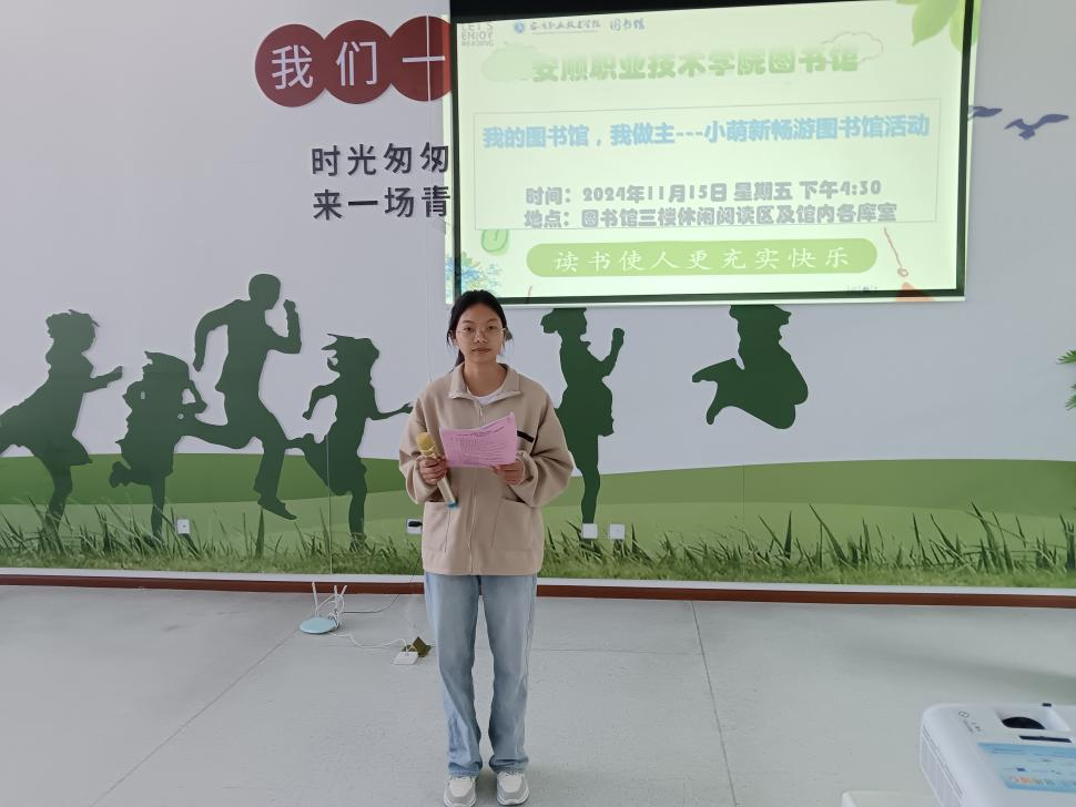 为了帮助2024级新生认识了解图书馆,感受书香氛围,养成良好的阅读习惯,同时宣传读书协会“读书、交流、服务,繁荣校园文化”的宗旨,11月15日下午“我的图书馆,我做主---小萌新畅游图书馆暨图书馆读书协会2024年新会员培训”活动在图书馆成功举办。校内新生代表及图书馆读书协会会员代表60余人参加活动。活动由读书协会会长郭贵欢同学主持。