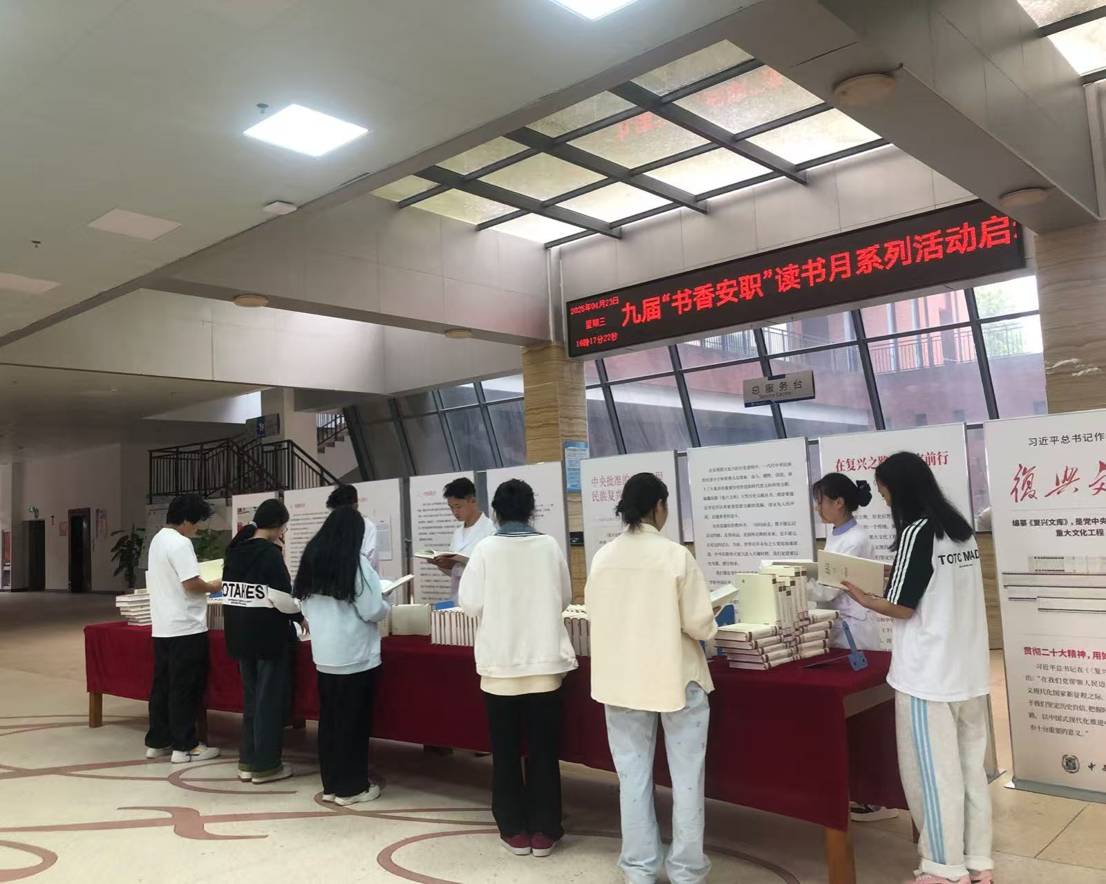 在第 30 个 “世界读书日” 来临之际,为传承中华文明,弘扬民族精神,图书馆在负一楼大厅举办了 “典耀中华 文启新程”为主题的《复兴文库》大型历史文献图书展。此次活动展出丛书第一至三编,涵盖 37 卷、195 册珍贵文献