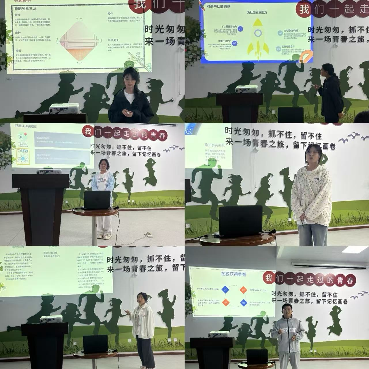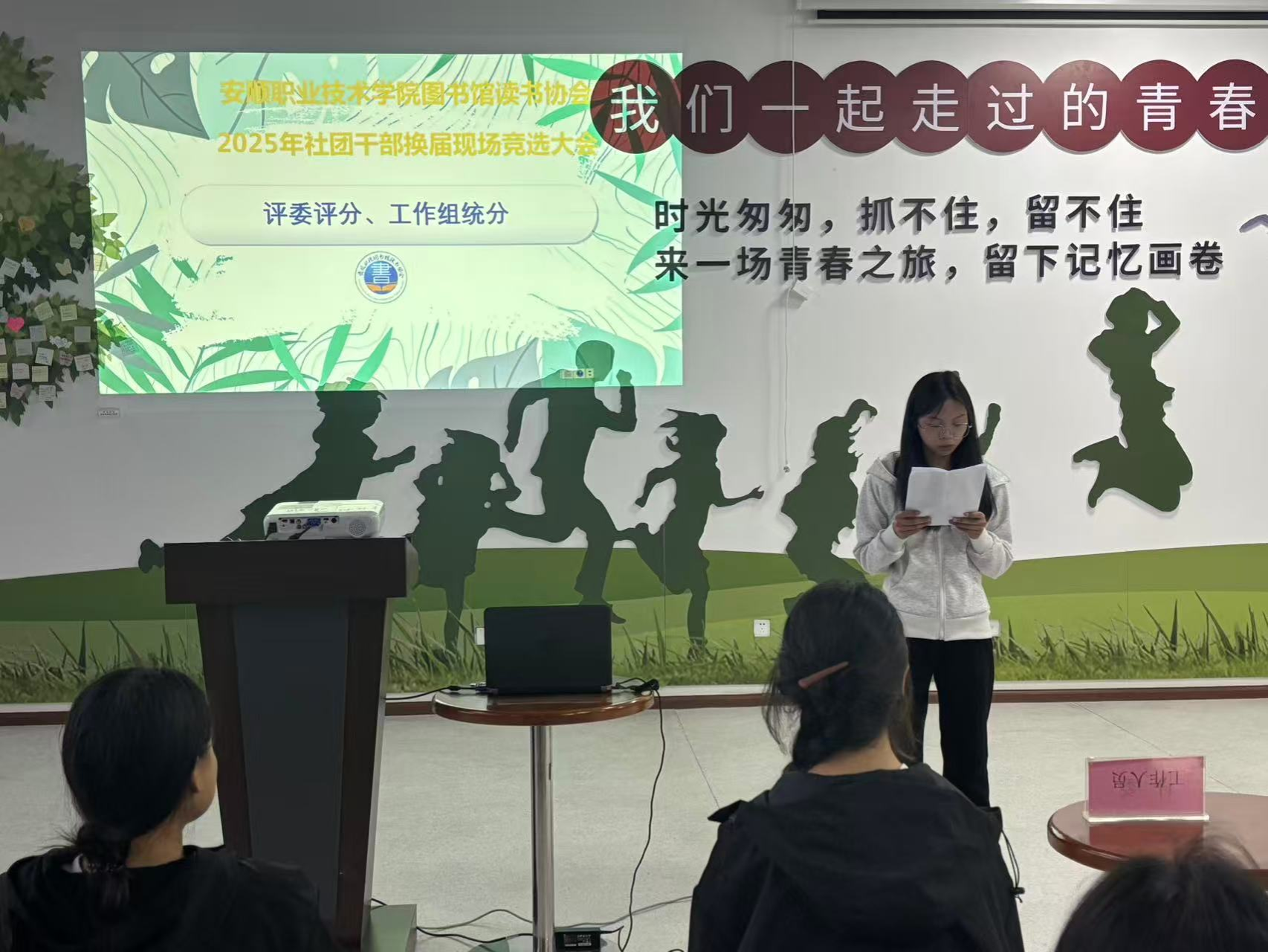 接下来,副会长肖双菊同学向与会评委和同学们逐一介绍了报名参加竞选同学的情况。本次共有6名同学提交了竞选申请表,副会长肖双菊同学号召竞选同学们积极参与到读书协会组织建设中来,并从中锻炼自己、提升能力、展现风采。
