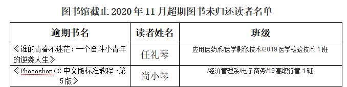 为了规范读者的借阅行为,提高图书馆馆藏图书流通利用效率,现对已超期图书未归还的读者名单予以公布。请各位有逾期未还图书的读者及时还书。请各位读者尽快到图书馆办理图书清还手续,带上借书人本人 “图书借阅证”,到图书馆二楼流通服务部找王老师办理。