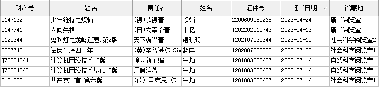 为规范读者的借阅行为,提高图书馆馆藏图书流通利用效率,现对已超期图书未归还的读者名单予以公布。请各位有逾期未还图书的读者及时还书。请各位读者尽快到图书馆办理图书清还手续,带上借书人本人 “图书借阅证”,到图书馆二楼流通服务部找王老师办理。