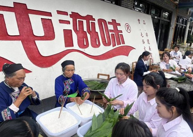 为了继承和发扬中国传统文化,加深青年大学生对中国传统节日的认识和理解。临近端午节,2023年6月16日下午2:00,旅游系团总支组织同学们来到了苗岭屯堡屯滋味开展了“浓情端午·粽享时光”端午节包粽子活动,同学们欢聚一起,共度端午佳节。