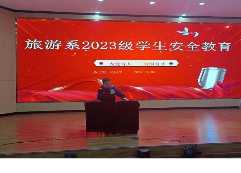 为了加强学生的安全与法治知识教育,进一步提升学生自我管理、自我防范意识,促进学生遵纪守法。2024年6月5日下午,学院保卫处处长深入到旅游系,在旅游系3D导游实训室开展2024年旅游系安全与法治教育讲座。本次活动由我系党总支书记鲍中刚主持,在校的2023级各班全体学生参加听讲。