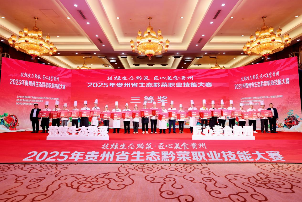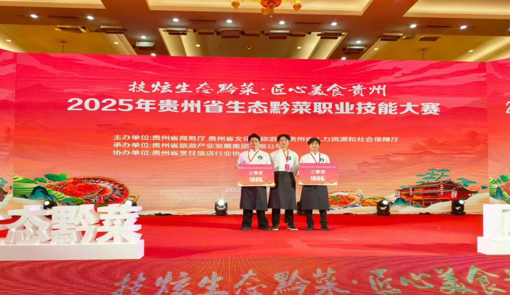 2025年11月5日,贵州省“技炫生态黔菜,匠心贵州美食”生态黔菜职业技能大赛在贵州饭店落下帷幕。安顺职业技术学院烹饪工艺与营养专业学生杨德强、田景宽在名厨新秀赛道上以黔味缤纷圆子、安顺灌汤猪脚两道黔味十足的菜品荣获三等奖,获得黔菜名厨新秀荣誉称号。