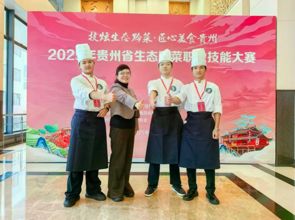 荣誉的背后离不开黄果树宾馆行政总厨李朋飞、旅游系汪妮妮、陆青三位老师的指导和学生们赛前一周刻苦地备赛训练,多次打磨菜品的色香味型,使菜品兼具美感的同时而不失风味。付出和努力总会有收获,黔味的传承与创新等着他们去书写。作为职业院校我们将继续与地方餐饮企业的大厨们一起助力黔味飘香,传播生态黔菜。