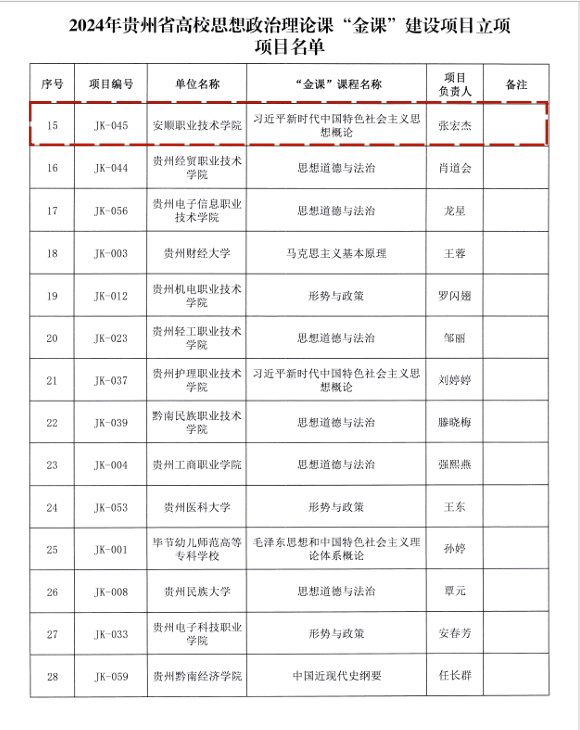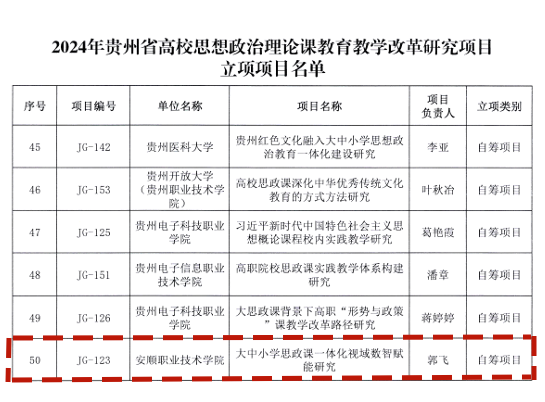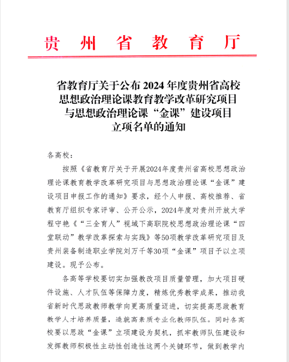 近日,贵州省教育厅公布《2024年度贵州省高校思想政治理论课教学改革研究项目与思想政治理论课“金课”建设项目立项名单通知》,由我部申报《习近平新时代中国特色社会主义思想概论》“金课”项目、《大中小学思政课一体化视域数智赋能研究》教改研究项目获得立项。