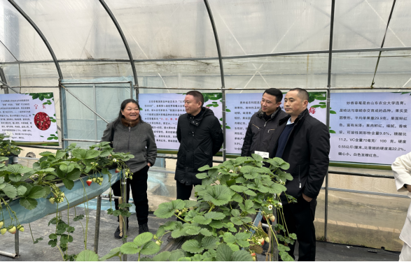 当天上午,谭晓燕教授在现代农业工程系党总支负责人邓朝晖和系主任叶方及市总工会副主席、省级劳模丁凯等同志陪同下,赴安顺市西秀区双堡镇大坝村、众鑫草莓基地开展现代农业产业考察调研。在全国美丽乡村示范村——大坝村参观了金刺梨种植基地、金刺梨酒厂、村史馆等,谭教授一行与大坝村党支部书记、全国劳模陈大兴同志进行了深入交流,详细了解了当地农村现代产业发展现状及成效;在西秀区众鑫草莓产业基地,谭教授参观了“空中草莓园”、品种园、组培室、育苗室,深入草莓种植大棚实地查看草莓的生长状况,听取基地负责人介绍了当前草莓种植规模、产量以及销售渠道等信息,提出了技术创新、产品升级、校企合作等方面的意见建议。