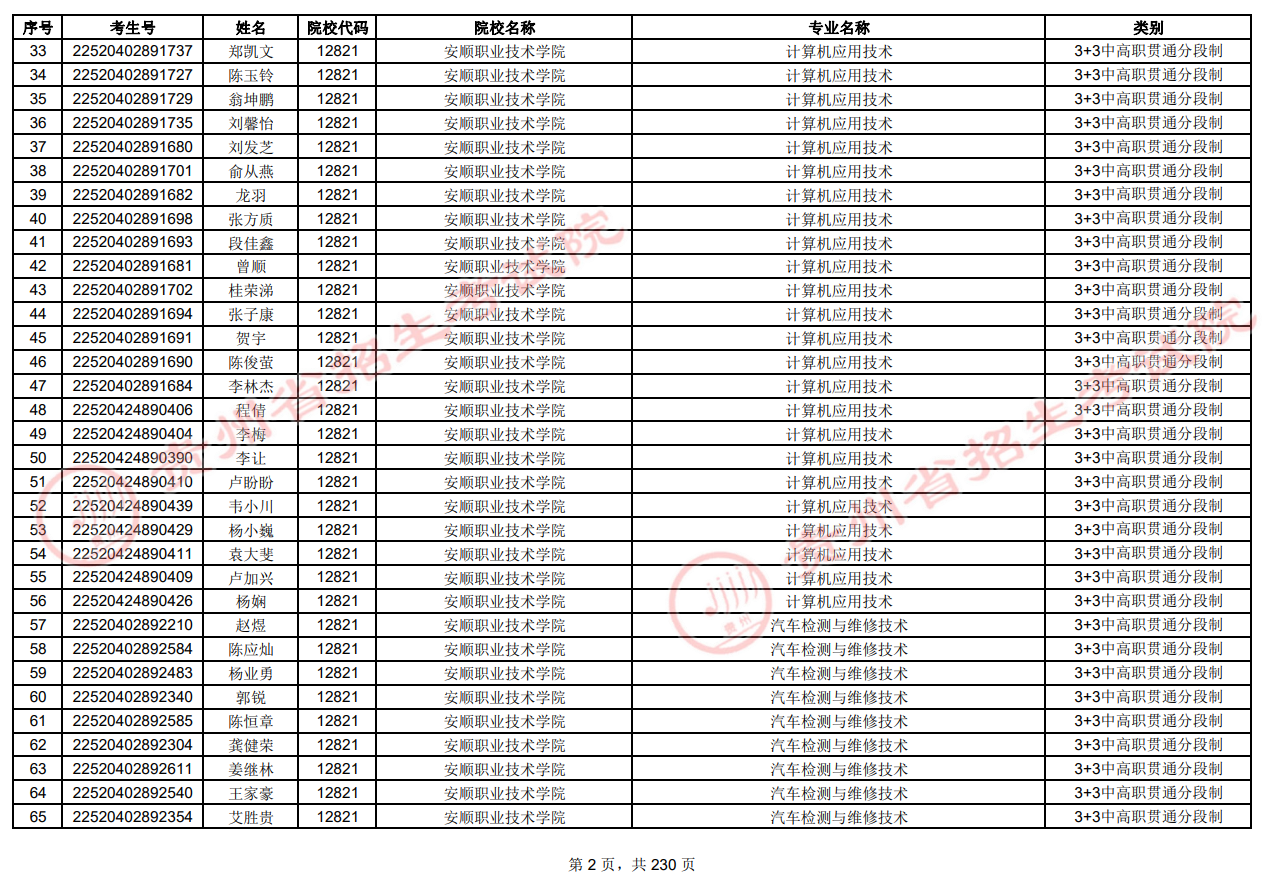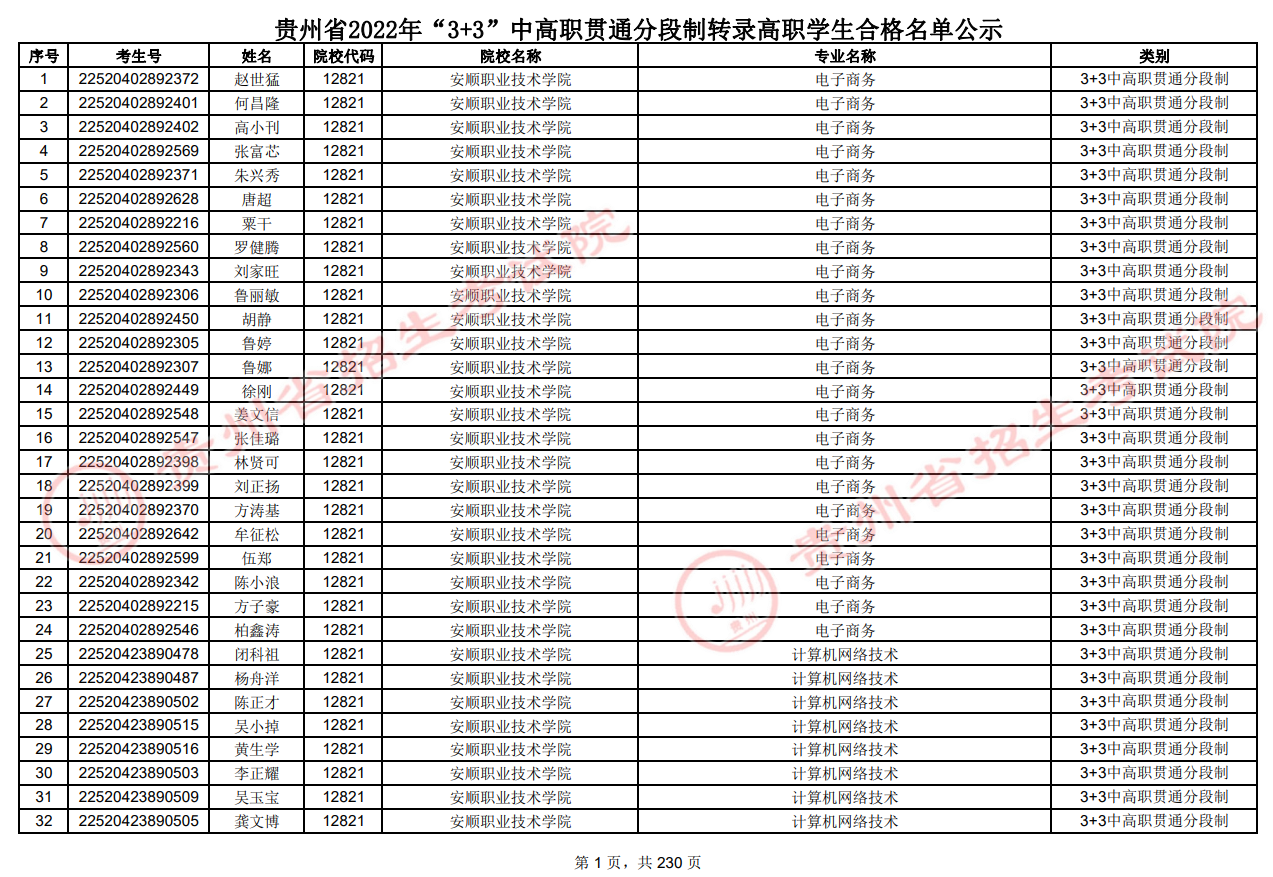 贵州省2022年“3+3”中高职贯通分段制转录高职学生合格名单公示.pdf